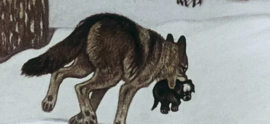 Волчица ищет, чем накормить своих волчат. Когда-то в молодости у нее было так много энергии и сил! А сейчас простая охота дается с большим трудом. Чтобы отвлечь волчат от голода, она играет с ними. А с наступлением темноты идет в село. Почувствовав нужный аромат в хлеву, она роется в сене и находит в нем ягненка. Берет его в рот и быстро убегает. Но добыча какая-то слишком мягкая, поэтому волчица отпускает животное и видит, что это щенок. Собачонок начинает лаять, и волчица уносит его в свое логово. Она решила сохранить ему жизнь. Тем более что он добрый и ласковый, играет с ее детенышами. Проходит время, и щенок самостоятельно убегает домой. Там он получает выговор от хозяина. Но зато про волчицу никто не узнал, иначе бы ее застрелили.