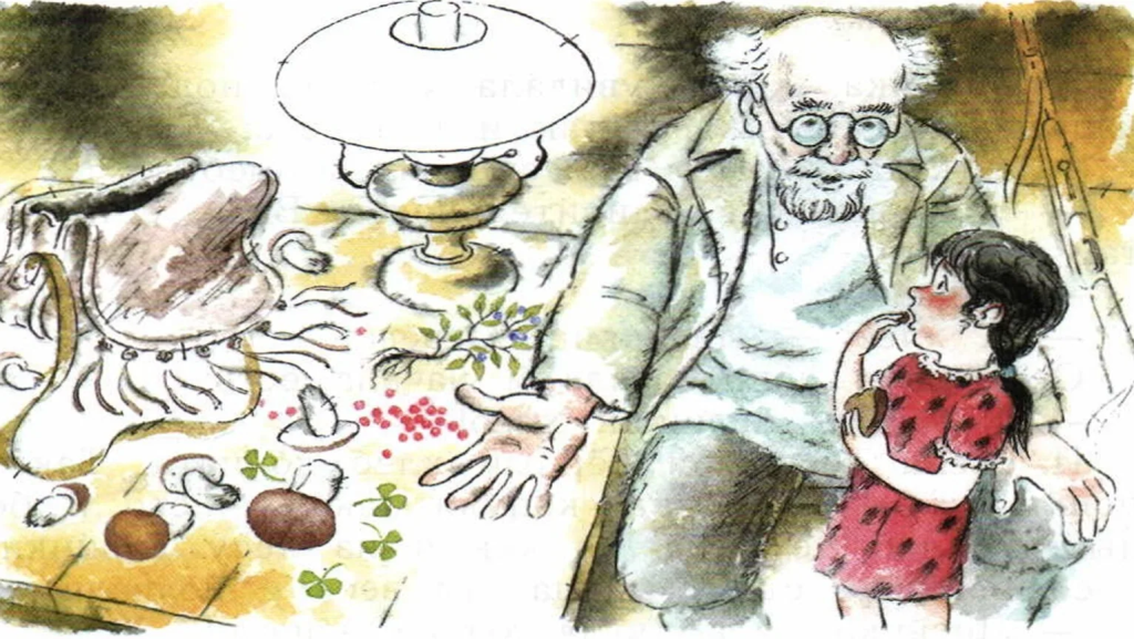 Охотник ходил по лесу весь день и домой пришел с полной сумкой интересных вещиц. Зиночка с восторгом и интересом рассматривала подстреленных птиц, разнообразные ягоды и грибы, травы и смолу. Автор со знанием дела рассказывал девочке о поведении лесных птиц, растениях и грибах, а также о живительном предназначении смолы, которая может излечить поврежденное дерево. На самом дне сумки обнаружился кусок ржаного хлеба. Эту незамысловатую пищу охотник взял с собой в дорогу, но не съел.